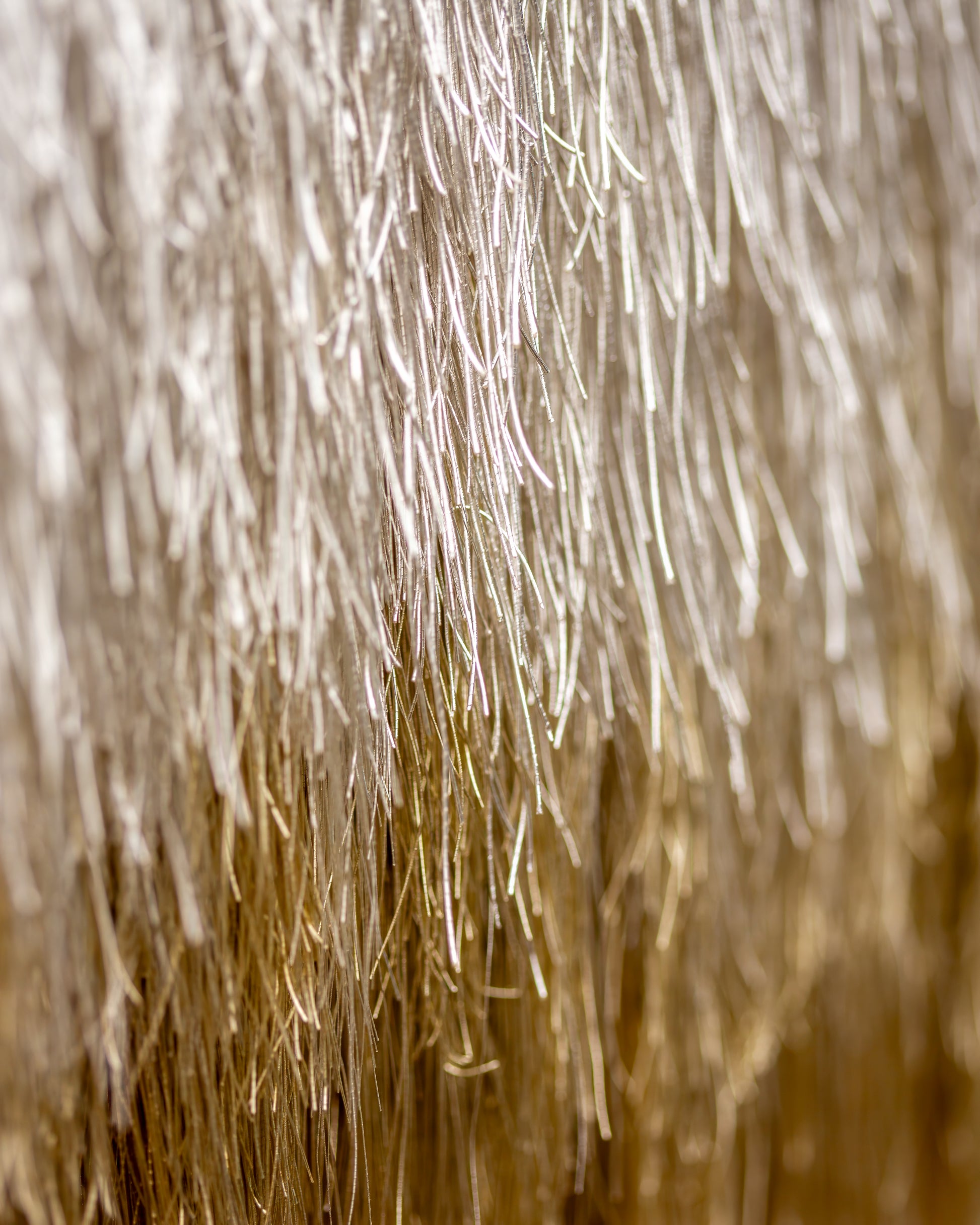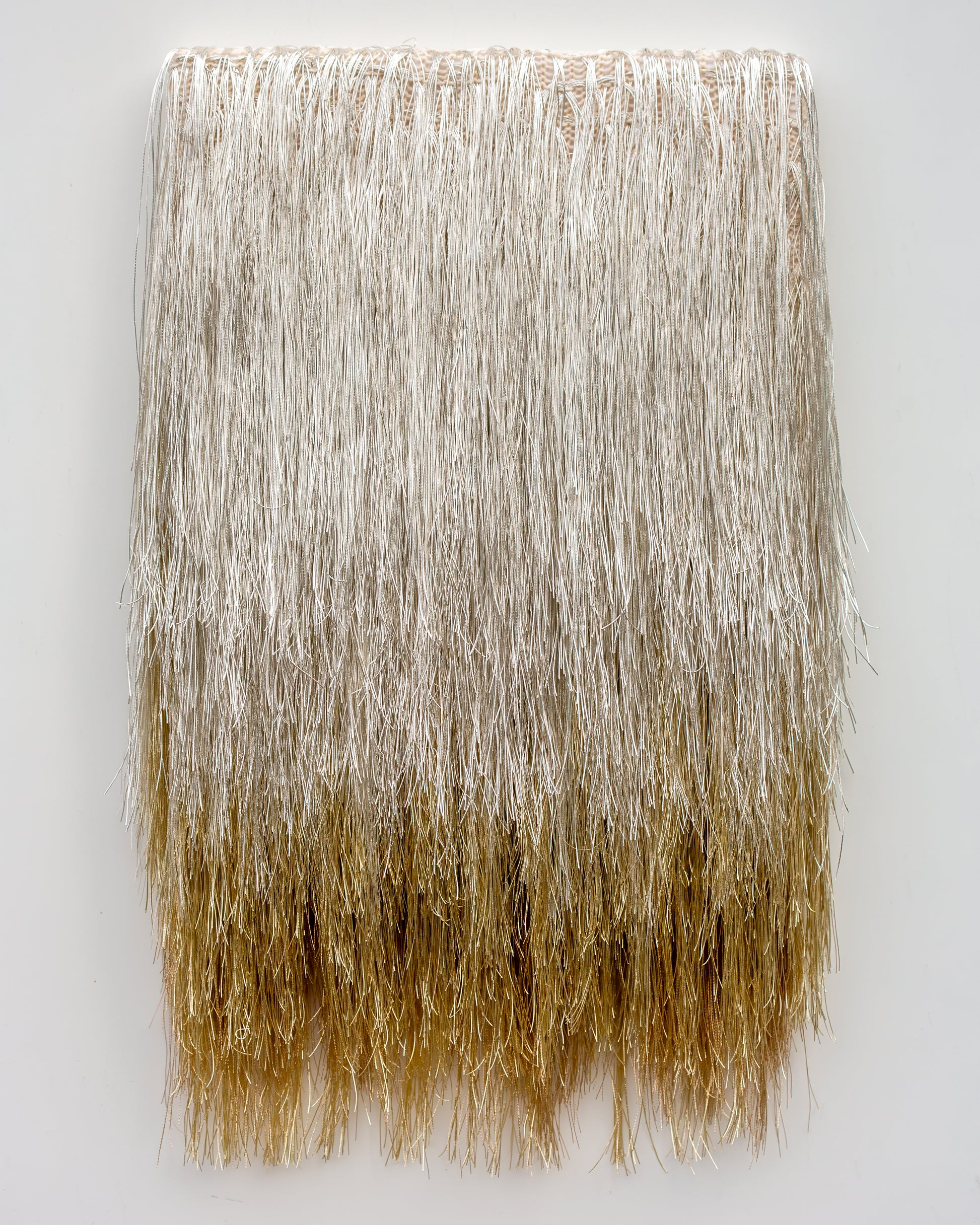 This work is made from layered Nishijin thread, drifting across the surface in a subtle gradient from bronze to gold to silver. Nishijin thread is a metallic thread with a silk core traditionally used in Japanese ceremonial textiles and is valued for its strength, precision, and reflective quality, allowing the surface to softly shift and glow as it catches the light.